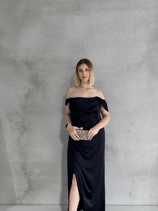 CLUB LONDON - EVA Black & White Bardot Bow Detail Maci Dress With Thigh Split (AU 18)