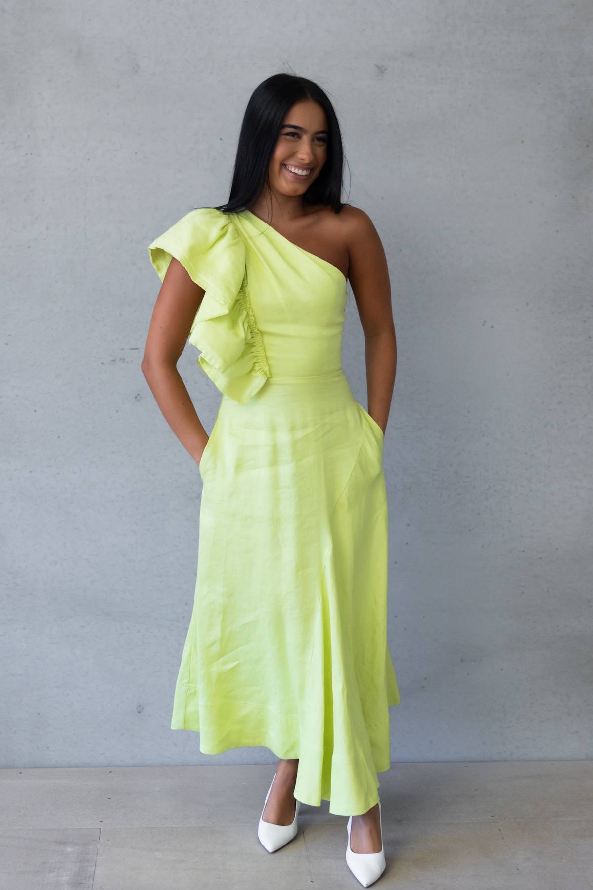 A dramatic showstopper that takes little to no effort, the Aje Bonjour Asymmetric Midi dress is the classically elegant answer to your year-round events in a punchy contemporary lime green shade.