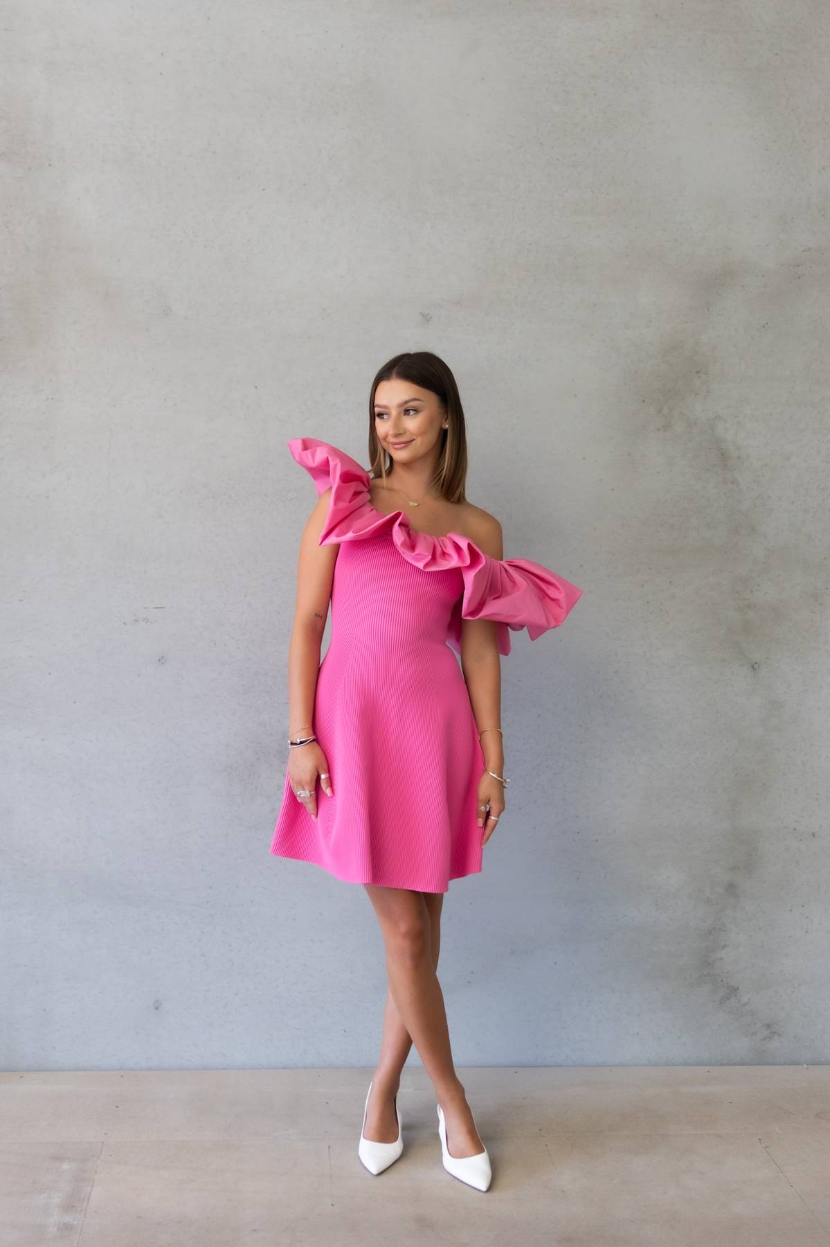 The Aje Eldora Mini Dress in Protea Pink is a standout piece that combines modern elegance with a touch of drama. This off-the-shoulder mini dress features a dramatic ruffled neckline and controlled puff sleeves, creating a bold silhouette. The fitted waist transitions into a flared A-line skirt, offering a flattering shape that's both playful and sophisticated. Crafted from a ribbed stretch fabric, it ensures comfort while maintaining its structured form. The dress is unlined, emphasizing its lightweight feel, and is best worn braless or with supportive inserts for a seamless look. Its vibrant pink hue makes it an ideal choice for events like weddings, cocktail parties, or the races.