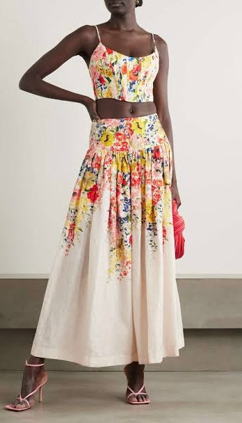 It's crafted from linen to a form-fitting corset silhouette and printed with multicoloured flowers in full bloom.