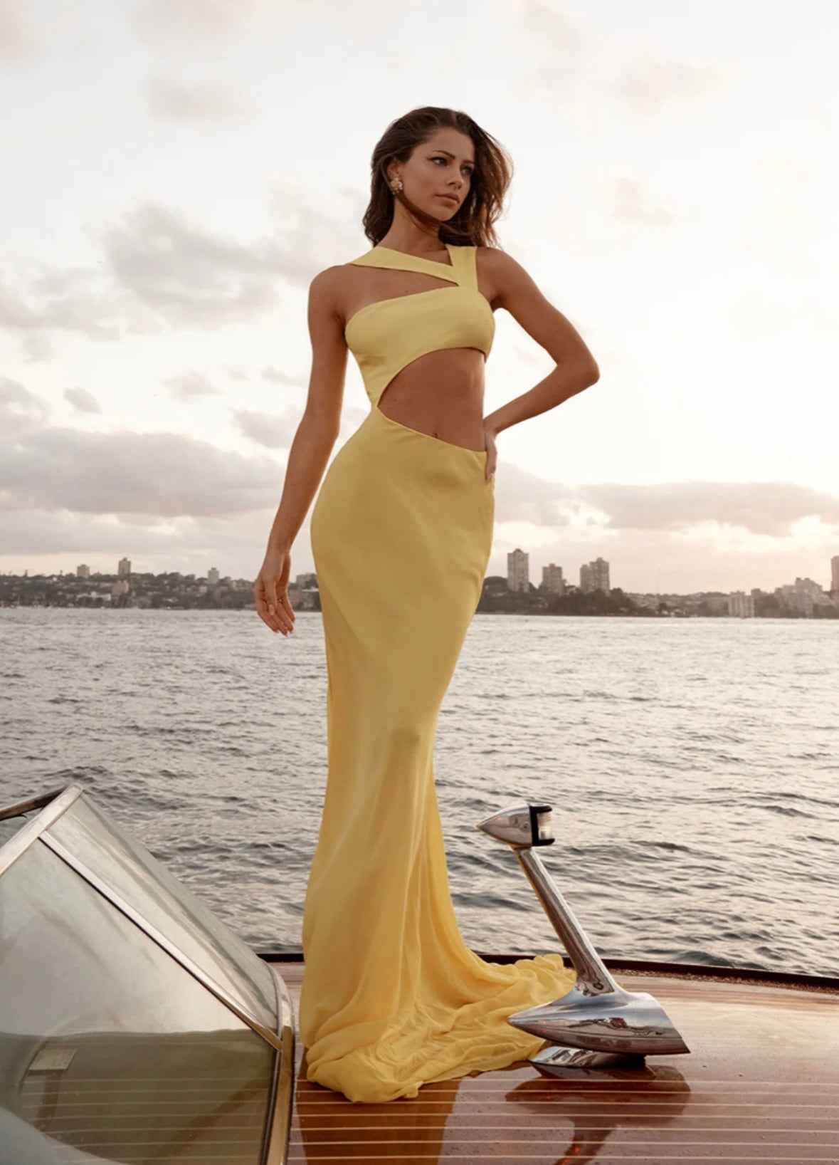 Evoking and alluring, the Graziana Gown demands all the attention. This bright yellow chiffon dress features an asymmetrical neckline, fitted silhouette, and a captivating cut-out. The Graziana Dress is the statement wardrobe piece you need.