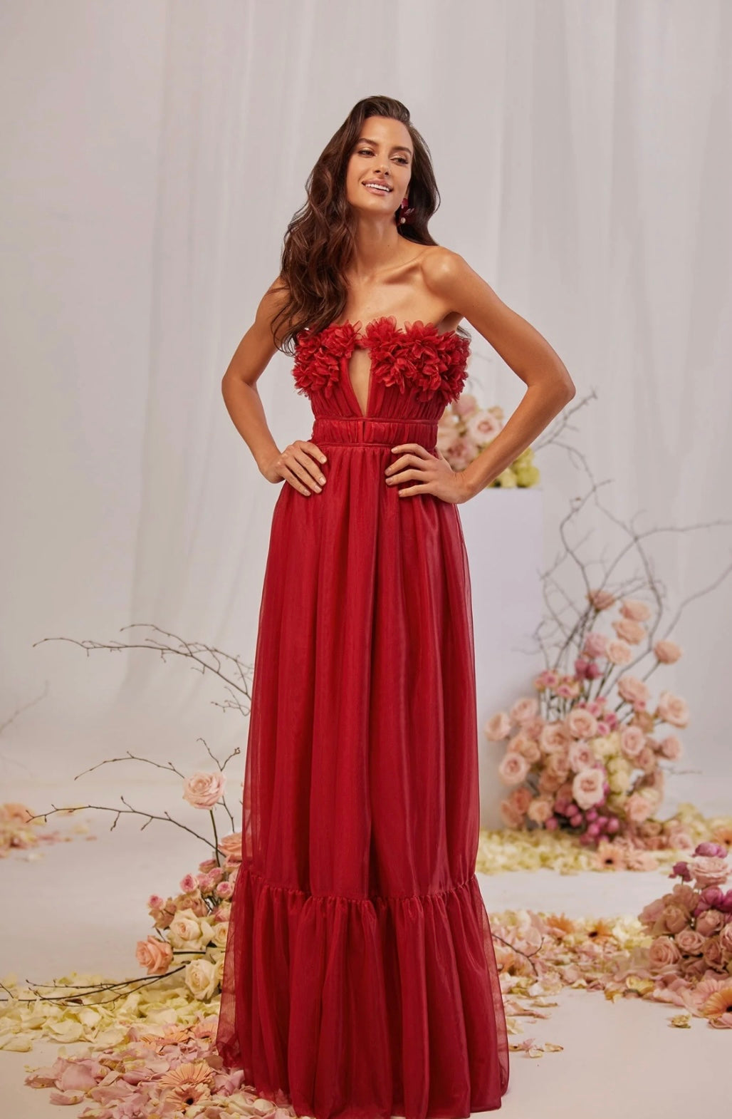 The Leonie Dress has an abundance of feminine details. You can't go past its iridescent mesh fabric, 3D ruffles, and plunge neckline. Sculpted with boning at the bust for support and an a-line silhouette for an extra dose of femininity. This is perfect strapless gown for a black tie wedding, gala, evening gown, formal, etc.