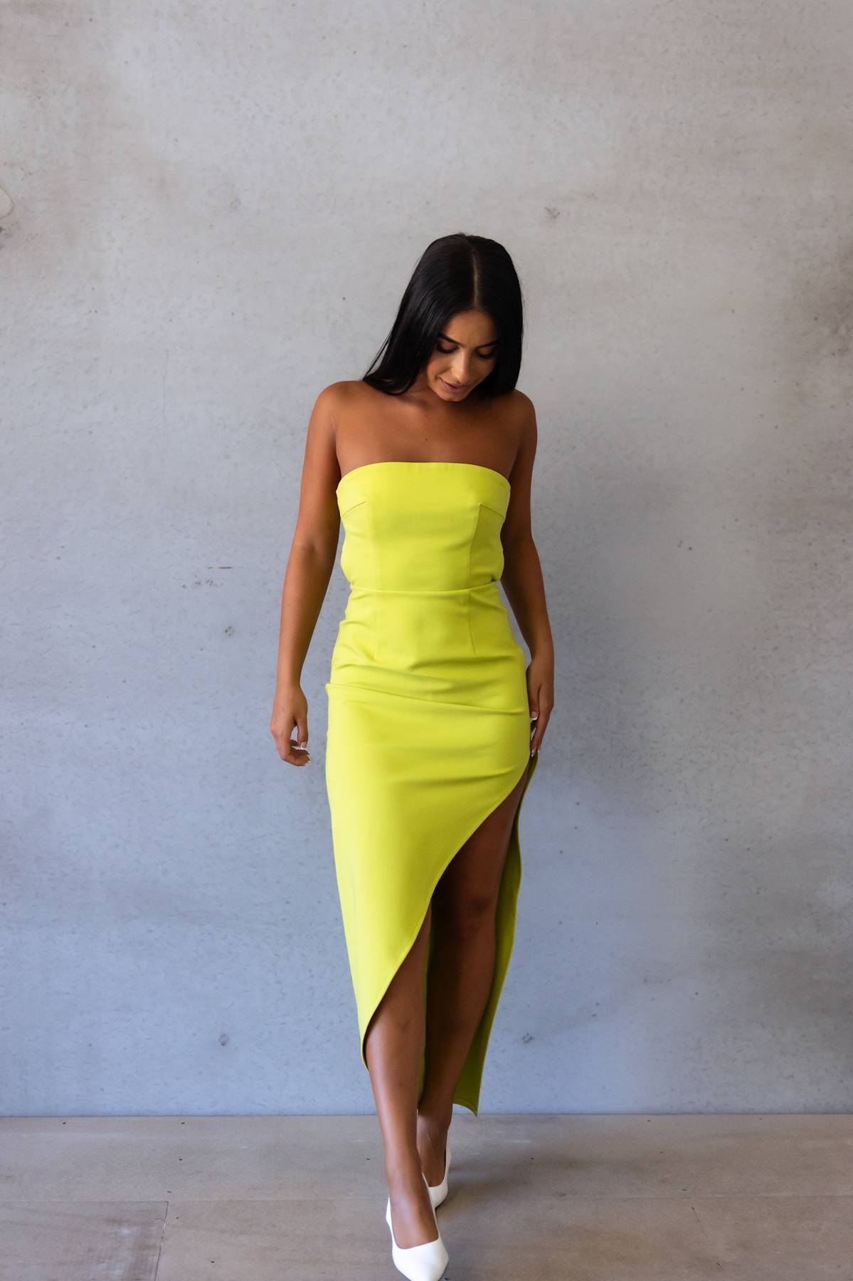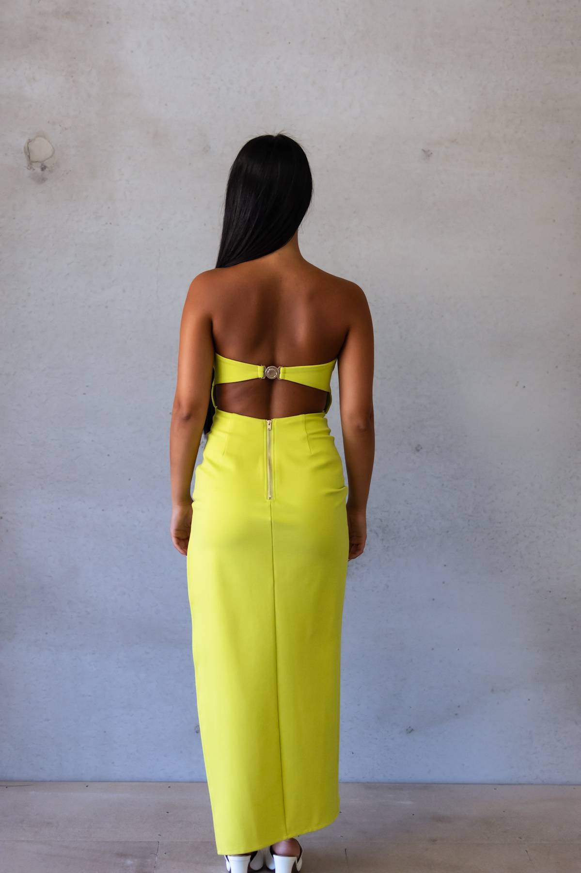 This beautiful lime coloured cocktail dress features a thigh high split and cut-out back detail, that is fastened with an elegant gold clasp