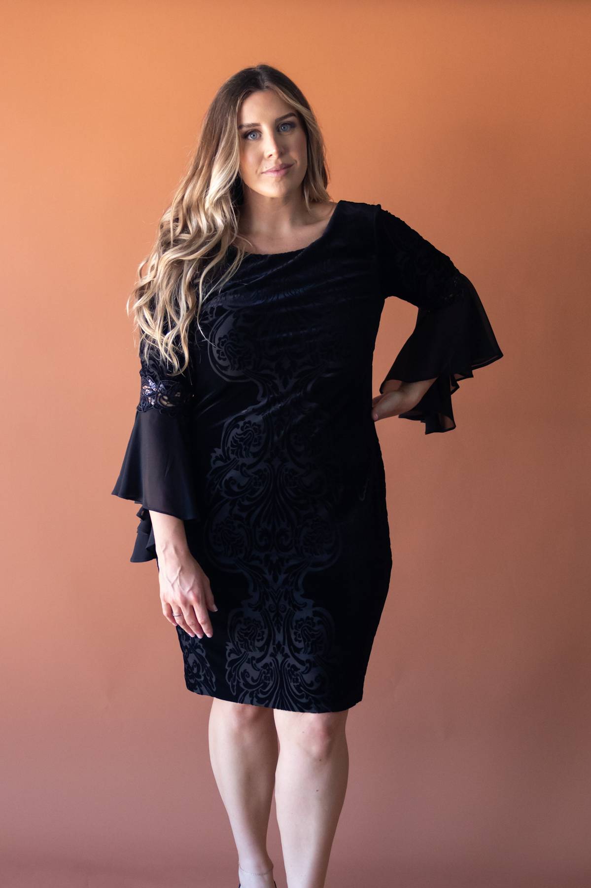 Crafted from luxe, textured velvet with a rich tonal pattern, this mini features a figure-skimming silhouette and eye-catching long bell sleeves for a touch of drama. The short hemline keeps it flirty, while the plush fabric and elegant sleeve detail make it perfect for special occasions, cocktail nights, or when you want to make an entrance.