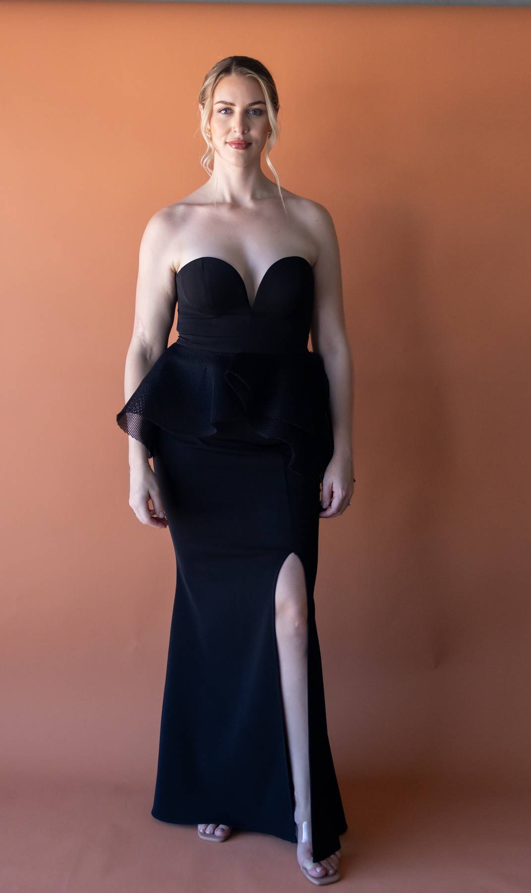 A showstopper in every sense, the Millennium Maxi Dress by Sheike is designed to make an unforgettable entrance. Featuring a structured, strapless sweetheart neckline and a dramatic mesh peplum detail, this figure-hugging silhouette flows into a mermaid-style skirt with a front slit for ease and elegance. Crafted in timeless black, it balances bold femininity with architectural flair—perfect for black-tie events, galas, or any occasion that calls for pure sophistication.