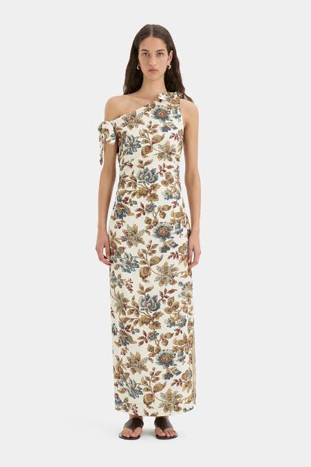 The Eleanora Tie Shoulder Dress is a repeat of our best selling Bettina Off Shoulder Dress. Crafted from a linen fabric in the SIR exclusive Viola print, drawing inspiration from palazzo wallpapers and intricate filigree florals. Featuring ruching through the waist for a flattering look, a side split and tie detail at the shoulder.