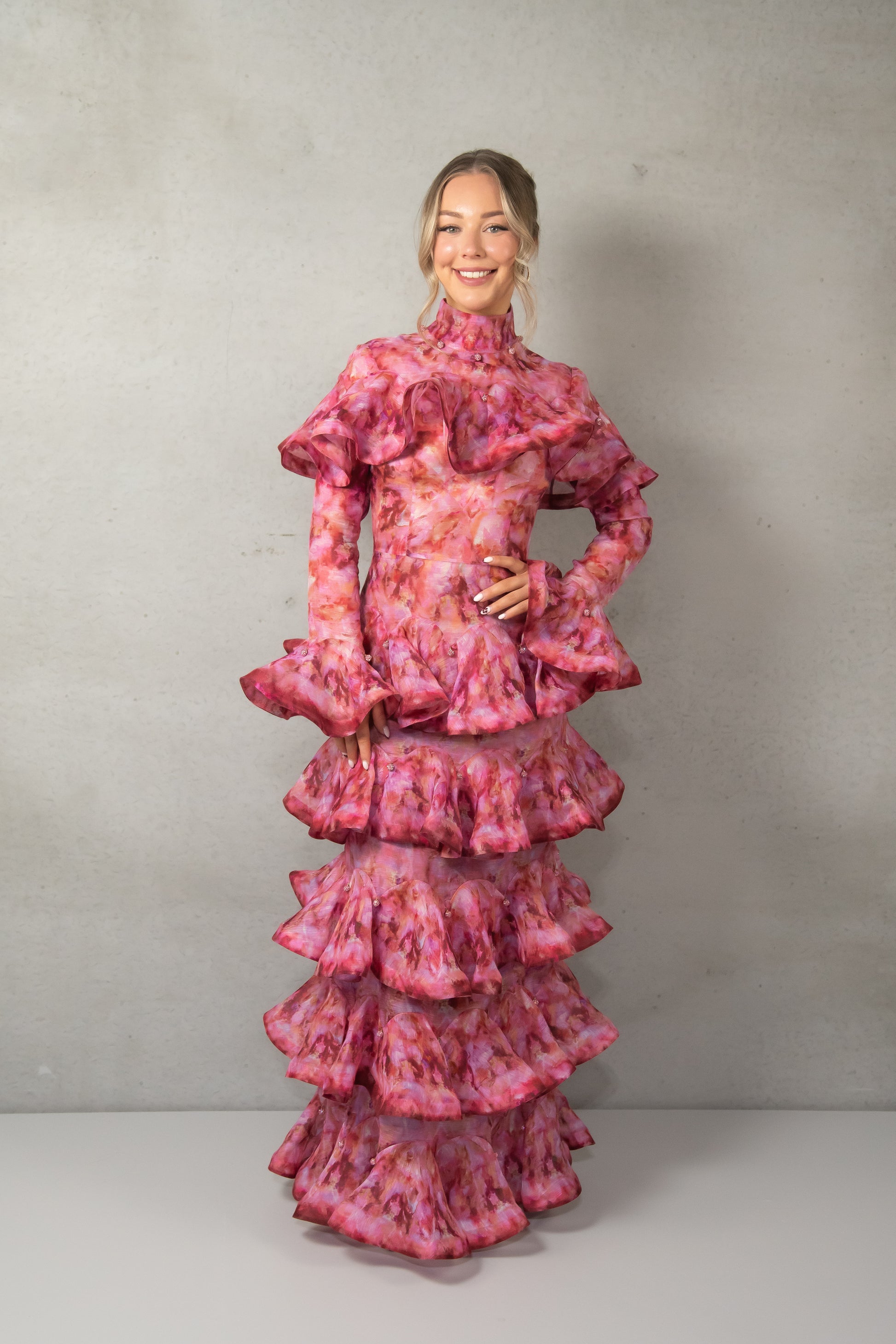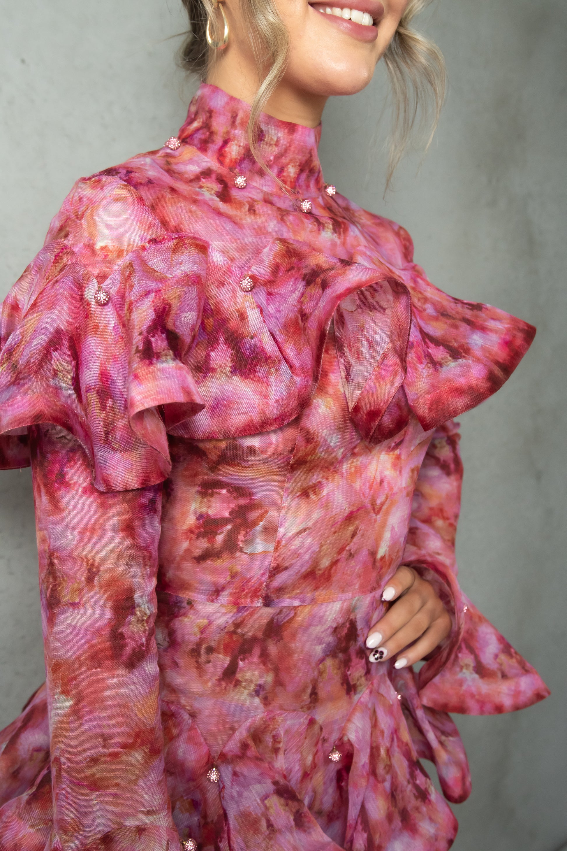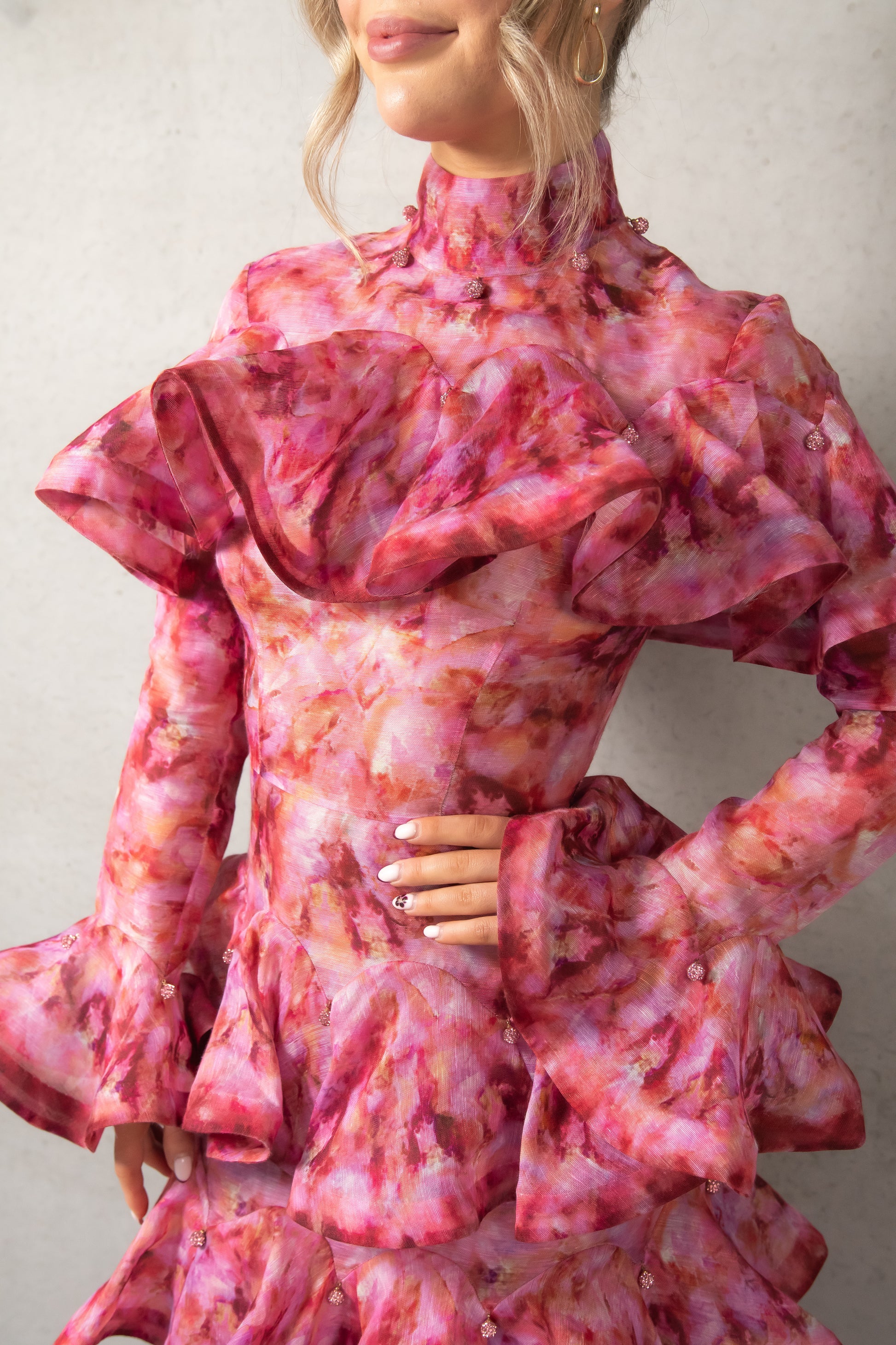 Zimmerman's pink Kaleidoscope high-neck dress is made from abstract floral-print silk-blend gauze to a form-fitting shape, complete with striking ruffles that express dynamic movement.